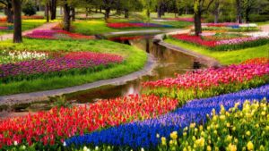 Wanneer de lente begint komen rond de 800.000 bloemenliefhebbers naar de beboste tuinen via slingerende wandelpaden te genieten van de kleuren, kassen, beekjes en lommerrijke vijvers: een onvergetelijke aanblik. In de Keukenhof zijn de talenten van de natuur samengebracht met kunstmatige precisie. Zo is een prachtig landschap ontstaan waarin miljoenen tulpen, samen met onder andere narcissen en hyacinten, precies op de juiste plaats en tijd in bloei staan. Gedurende het seizoen worden er steeds verse bloemen bijgeplaatst. In de paviljoenen op het terrein zijn speciale tentoonstellingen te zien en uiteraard zijn er cafeetjes en standjes met eten en drinken te over.